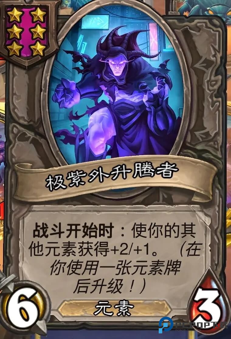 新补丁对极紫外升腾者进行了削弱,效果变为战斗开始前使其他元素获得身材提升,现在不能加自己的身材,其实对于这个流派影响不大,正常我们场上也能通过两个极紫外升腾者互相加buff获取身材。需要注意的是这张卡在手牌的时候,使用元素是不能获得效果提升的,尽量在刷到极紫外升腾者的第一时间挪位置让他上场。极紫外升腾者普通卡是一张元素就提升+2/1的数值,合金翻倍为+4/2,熟练之后一局极紫外升腾者提升破百是很容易的。