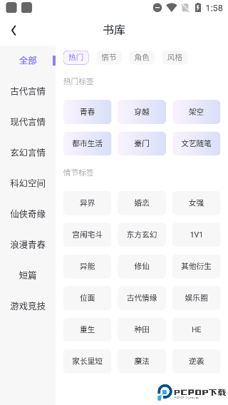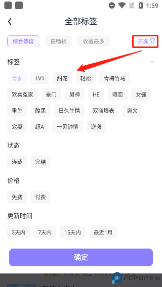 3、例如选择“青春”题材的小说,点击右方筛选还可添加如“1v1”、“甜宠”或“轻松”等更多的标签以更准确的定位