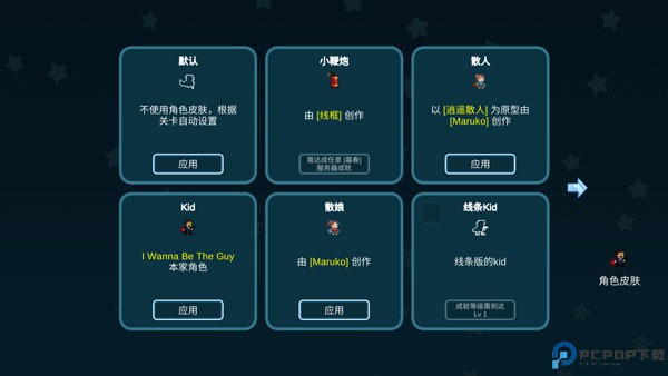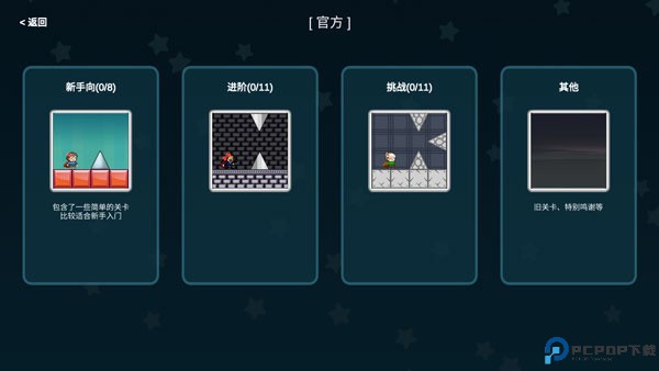 I wanna be theCreator在经典的iwanna游戏基础上新增了全新的关卡编辑器功能,游戏自带了31张预设官方关卡,供玩家游玩的同时,还可让玩家对这些关卡进行研究,探究出关卡设计的奥妙,并创造出属于自己的特色关卡,并通过分享让其他玩家进行挑战。