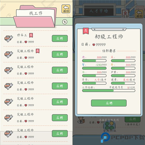 2、工作:崽崽们完成学业即可参加工作,但大多数工作有学历要求。我们在游戏中设计了许多工作岗位。每个岗位要求的属性值,学历,工作经验,健康状态不同。越高级的岗位要求越高,当然工资也相对越多。这样就需要我们的玩家大大不断学习提升自己的各项属性,同时积累行业经验。