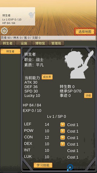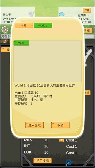 3、有了转生者,你可以在屏下左侧栏查看转生者的能力,接着就是把他分配到异世界去。点击屏上右下角的“选择地图”按钮,并且选择World1和Map1。