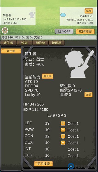 4、在转生者抵达异世界后,点击屏上右下角的“战斗按钮”就会自动战斗,并推进地图进度,即便转生者在冒险途中血量为0,也会只是休息一下后继续战斗,根据击败敌人和所处区域,转生者就会获得EXP并升级。在屏下转生者的菜单中可以分配升级得到的SP,强化转生者在异世界的战斗能力。
