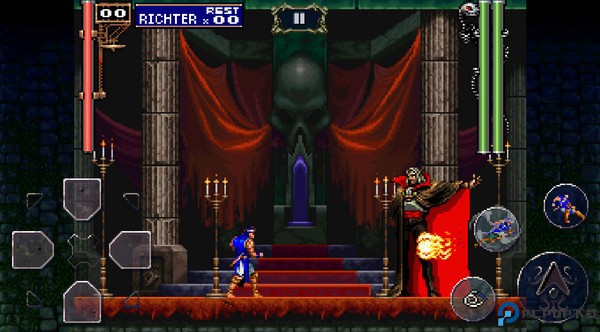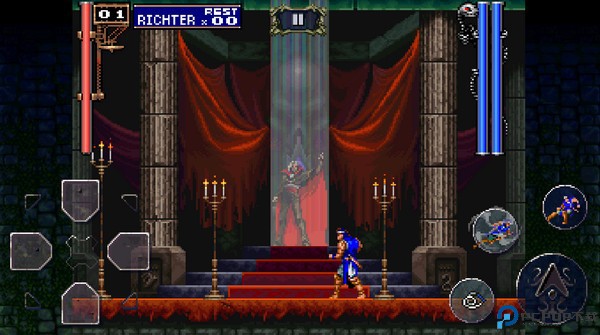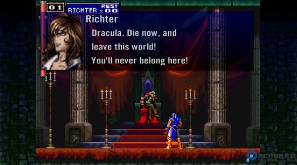4、血之轮回战斗:游戏开场承接《恶魔城X:血之轮回》,里希特杀入王座间,与德古拉决战。
