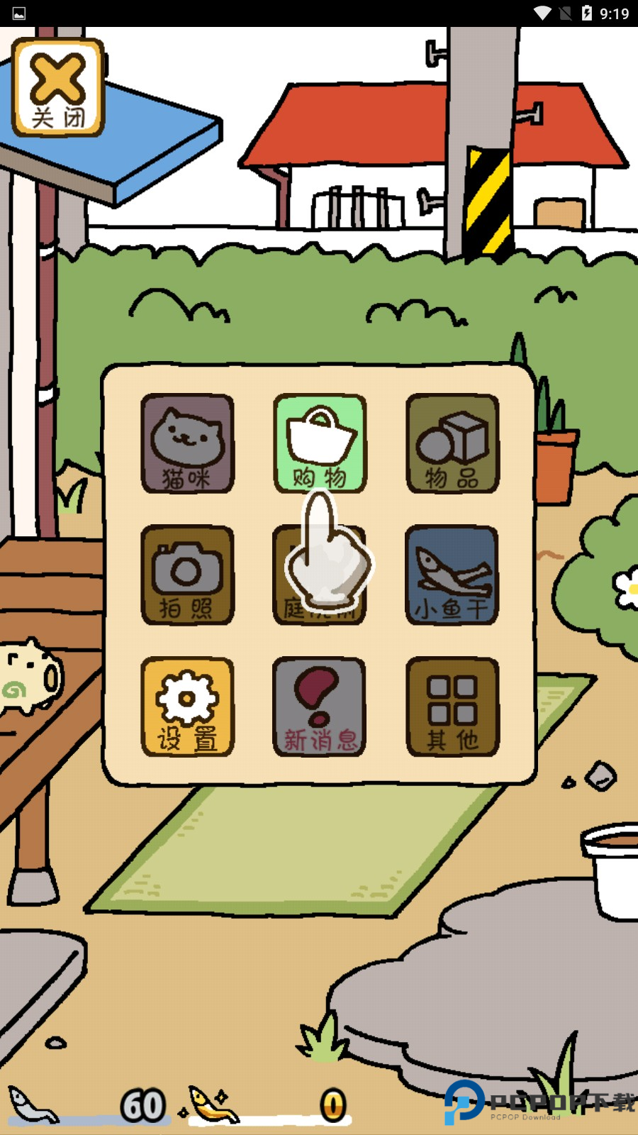 4、打开包含猫咪管理、购物中心、物品栏、拍照功能、小鱼干兑换及游戏设置等多种操作选项。