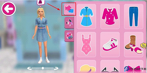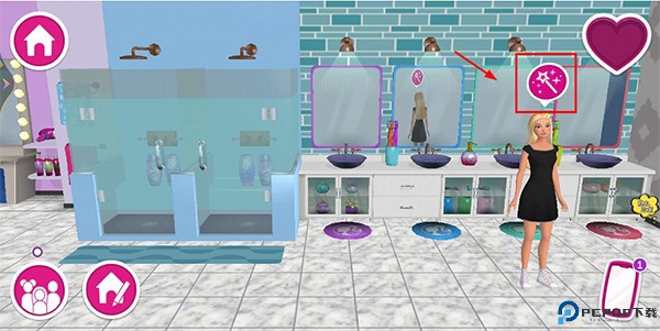 1、进入芭比梦想豪宅游戏,点击芭比头上图标,即可进入芭比换装的页面