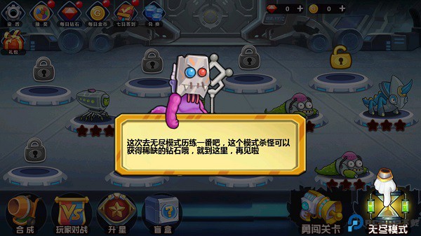 4、此外,想要合成高级怪物,需要消耗大量资源,除了在闯关挑战成功后可以获得一些金币奖励后,在主界面还有抽奖、每日钻石、每日金币和签到福利。期间,你也可以前往无尽模式历练一番,在这个模式杀怪可以获得稀缺的钻石。