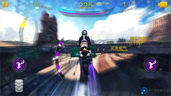 3、想要更快的获得紫色额外氮气,我们要通过腾空动作来获得,在遇到有腾空踏板的时候,飞上空中,然后会出现特技按钮,人物左侧的指针会从下网上滚动,当滚动到紫色区域,玩家能够点击两边的特技按钮,即可让驾驶人员在空中做特技,同时获得高额的紫色氮气补充。