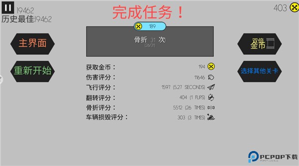 6、最后任务评分依据火柴人和汽车受到的损坏程度,损毁越严重,评分越高,奖励越丰富