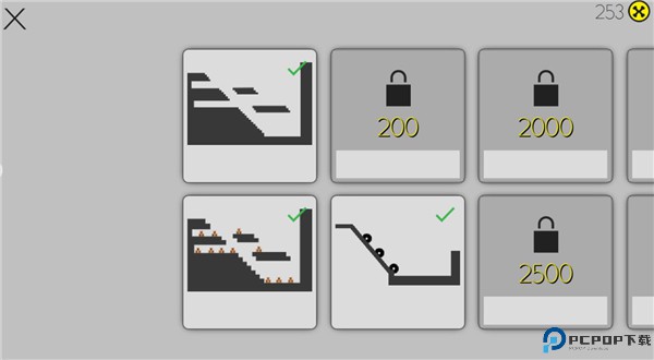 2、选择关卡,里面有各种关卡可以解锁,金币越高的楼梯场景布置就越复杂,火柴人受到的伤害越高的可能性就越大,获得的评分就越高,奖励就越多