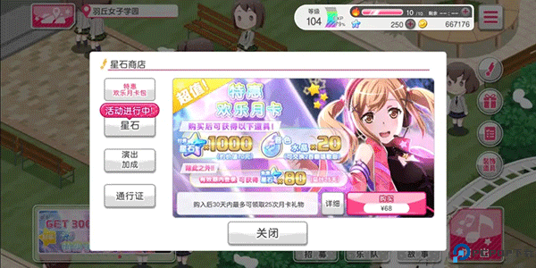 1、月卡(68元)购买后立即获得付费星石1000与音色水晶*20(可在用来购买歌曲),并可以在30天的有效期内领取最多25次免费星石80。共计获得付费星石1000,免费星石2000,月卡不可叠加购买,合计性价比(1:44.1)