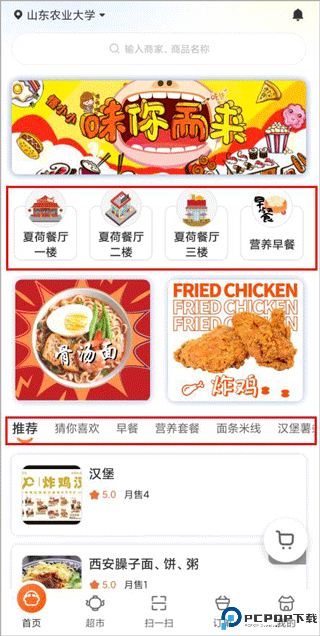 1、打开悟小小即可看到其中有首页、超市、扫一扫、订单、我的等版块,首页多是根据用户喜好推荐的外卖产品以及合作的高校食堂;