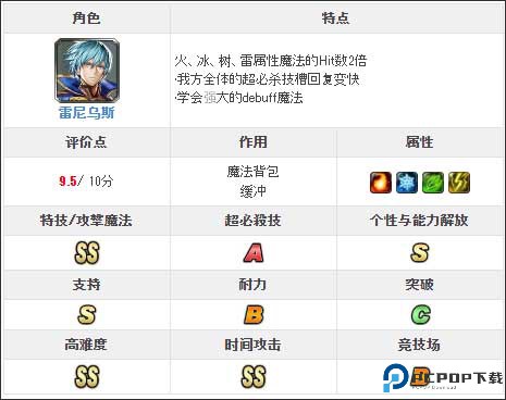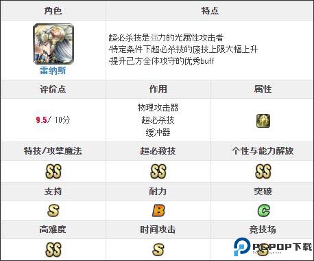 雷纳斯的超必杀技是光属性非常强的攻击者。不仅攻击性能高,由于“不死之徒的净化”的个性效果能给全体友方赋予STR和INT,SCT回复速度增加的buff,因此具有非常高的通用性。