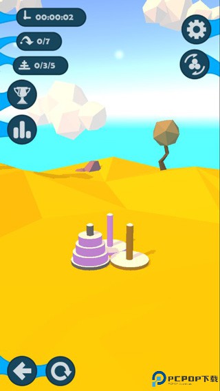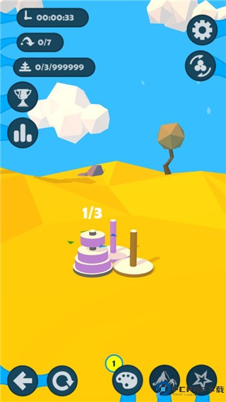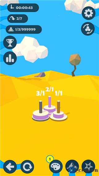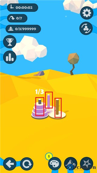 在汉诺塔中文版游戏里,玩家需要将杆上的圆柱根据颜色来依次放在正确的位置,并利用其他两杆来作为移动的辅助,并按照从大到小的顺序来叠加。游戏提供非常丰富的游戏关卡,游戏玩法也非常简单且容易上手。