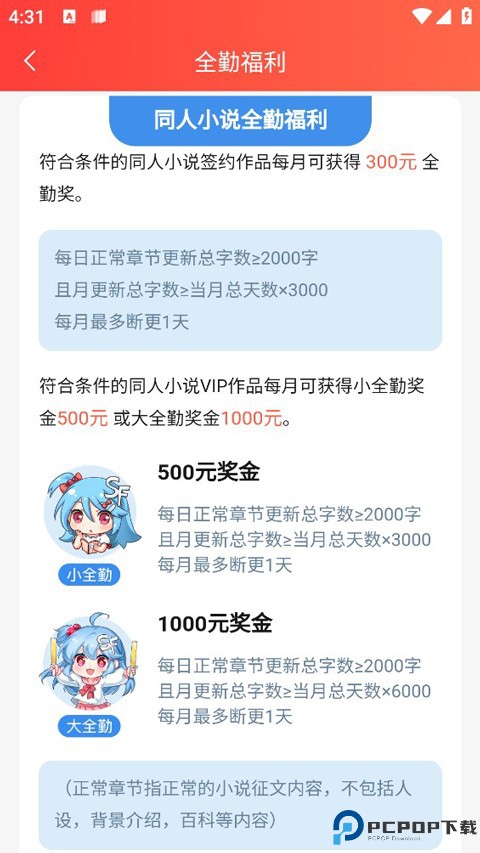 「同人小说全勤福利」符合条件的同人小说签约作品每月可获得300元全勤奖。