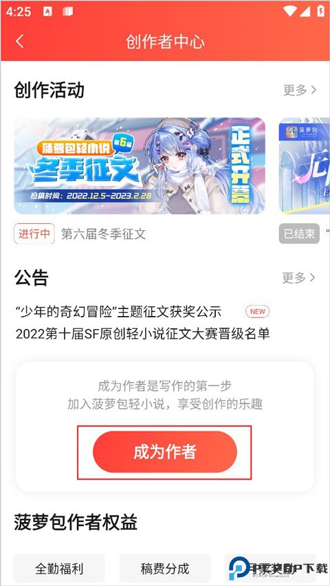 菠萝包轻小说是SF互动传媒旗下轻小说阅读类App,是国内目前已知最大最专业的的原创轻小说创作、分享、阅读平台。这里拥有轻松有爱的创作分享,每个喜爱轻小说的人都可以在此一展拳脚、寻找同好,那么具体要如何成为菠萝包轻小说的签约作者?