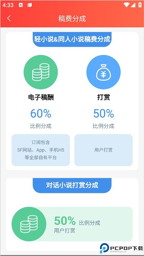 二、稿费分成轻小说 & 同人小说稿费分成:电子稿酬60%比例分成;打赏50%比例分成。