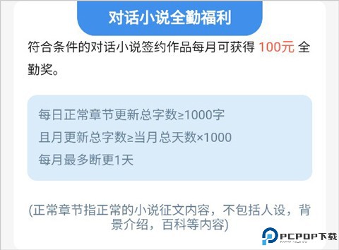 「对话小说全勤福利」符合条件的对话小说签约作品每月可获得100元全勤奖。