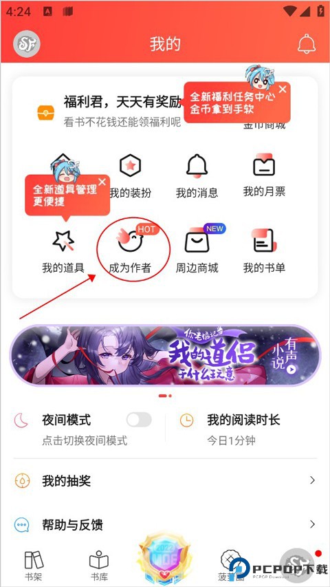 1、首先要优先注册账号并进行登录,接着在“我的”个人中心里面找到「成为作者」。