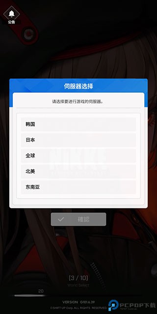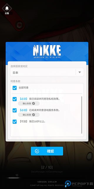 1、首先需要我们选择国家地区(服务器选择在后方),勾选全部同意选项后,之后点击下方确认按钮;