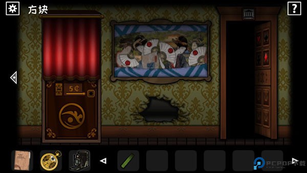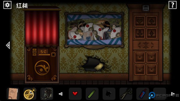 15、五图用相机观察,挂画下方有个红色的X,用锤子砸破后得到红桃和纸片。