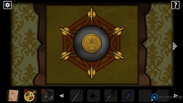 13、依旧是寝室,墙上有机关画,根据图书馆左边墙上的乌鸦可以知道要六把剑全部朝里,开始扭机关,左下角开始扭动剑,点击剑可以扭动剑头指向的方向那把剑,扭好后在机关中间获得硬币。