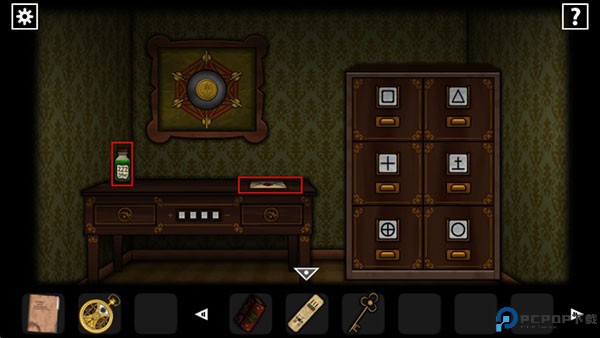 5、出来到右边的门(餐厅),拿走柜里的书,用钥匙打开下面的柜子拿走甜味剂和密封的酒,把酒放进柜顶的开瓶器,根据二图右边骷髅画上的眉毛位置以中中,上下,中上,下下,上上的顺序开瓶,摆好一次按一次红色按钮,拿走打开的酒,把安眠药水和酒倒进桌上的高脚杯里,获得一杯酒。