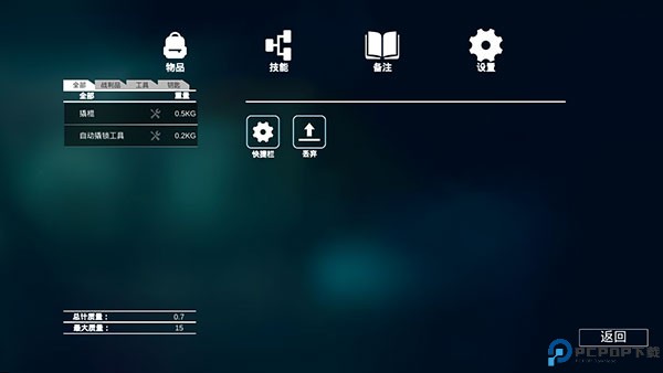 7、点击右上角齿轮图标,打开物品栏,物品可设置快捷使用或丢弃,但需注意背包有重量限制。