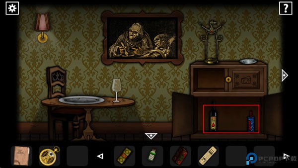 5、出来到右边的门(餐厅),拿走柜里的书,用钥匙打开下面的柜子拿走甜味剂和密封的酒,把酒放进柜顶的开瓶器,根据二图右边骷髅画上的眉毛位置以中中,上下,中上,下下,上上的顺序开瓶,摆好一次按一次红色按钮,拿走打开的酒,把安眠药水和酒倒进桌上的高脚杯里,获得一杯酒。