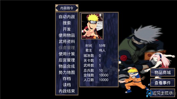本作在三国群英传2的基础上融入了火影忍者的角色与地图,玩家可以扮演忍界的一方势力,如大筒木辉夜、漩涡鸣人、六道仙人等,从而成为君主,招募武将,征伐其他势力,最终一统忍界。游戏拥有广阔的地图和丰富的武将以及多样的物品,玩家可以在其中体验火影的剧情。