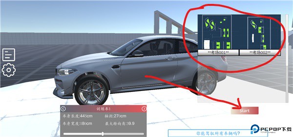 2、进入游戏后玩家可以查看车辆的各种能够数据,还可以选择考试场地,点击start即可开始游戏。