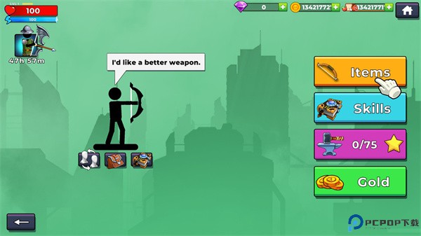 1、首先打开弓箭手2中文版游戏,先跟着新手教程走,点击ITEMS。