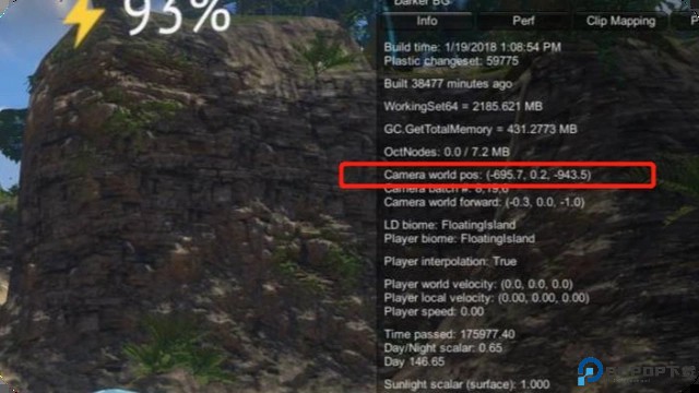 3、我们可在附近发现绿岛底部,按F1键查询所在坐标,并向(-695.7,0.2,-943.5)位置靠拢,可以找到登岛入口。