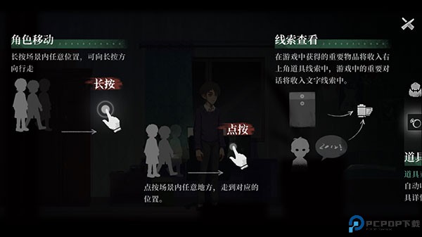 2、对话结束后,会有操作提示,帮助玩家快速上手;长按场景任意位置即可向对应方向移动。