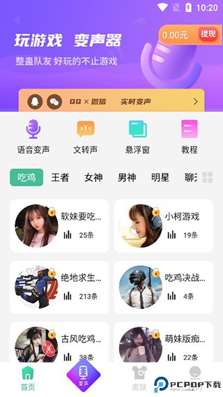 1、下载安装本站提供的tt变声器手机版,进入之后可以在主界面当中找到自己喜欢的语音包类型;