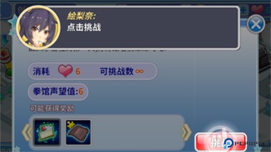 5、点击挑战进入战斗,包括体力消耗、挑战次数、奖励等提示,正式开启美女拳击竞技。