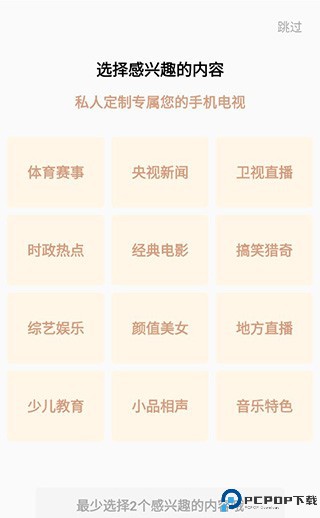 用户在本站下载并打开软件之后就会跳转到爱好选择页面,可以选择自己喜欢观看的内容,也可以点击右上角跳过。