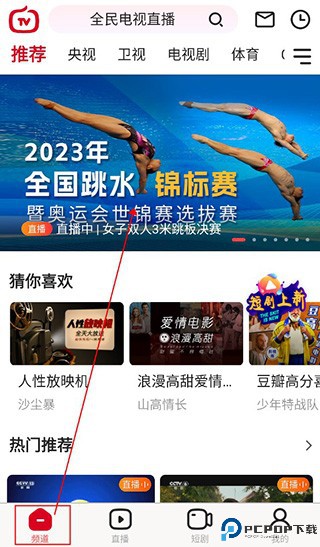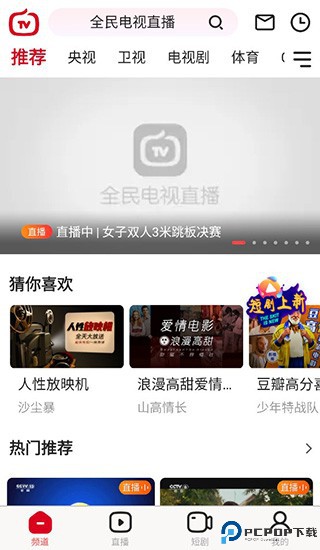 用户进入频道页面就可以开始看电视直播啦,可以在屏幕上方的分类里选择推荐、央视、卫视、电视剧等视频分类进行观看。