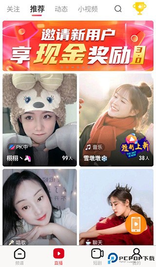 用户点击下方的直播,即可进入直播页面,可以查看推荐直播,也可以浏览一些主播或用户发布的动态、小视频等等。