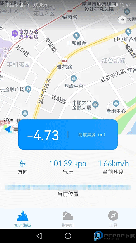 2、返回至软件实时海拔页面,你可以看到你当前所处的位置、方向、气压等具体信息。