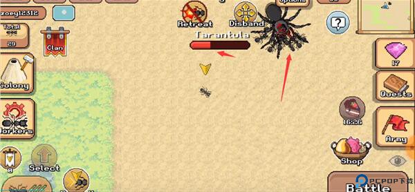 4、移动控制其他的蚂蚁去攻击其他的动物,需点击下方的battle,这里还可以查看血量;