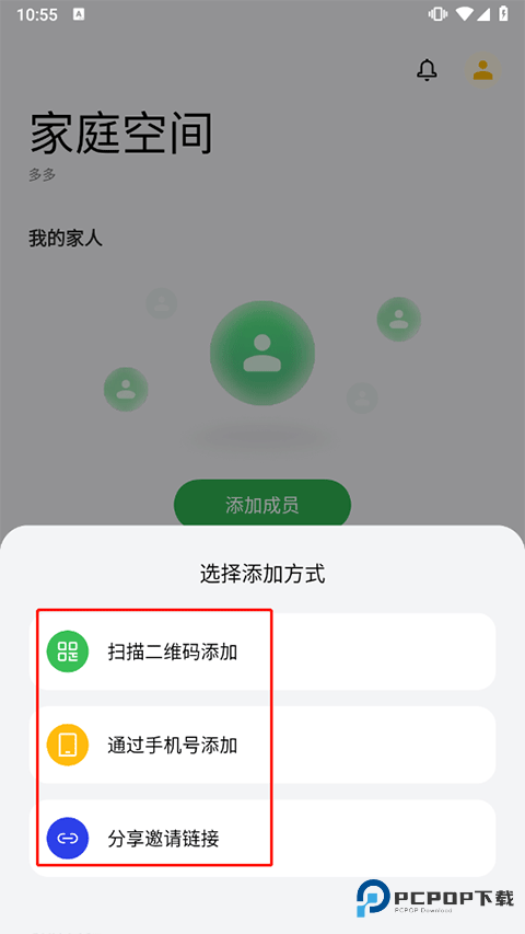 4、根据需求选择添加方式。若采用扫描二维码方式,需成员登录自身 APP 账户后选择“加入家庭”功能并进行扫码操作。