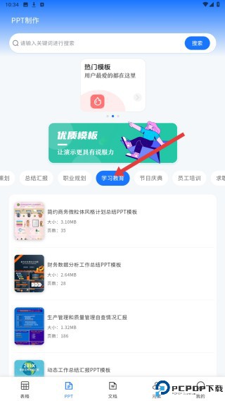 2、PPT制作界面,设有搜索框,展示热门模板,如学习教程、工作总结等分类,列出简约商务等模板,用户可按需选择,助力制作出有说服力的演示文稿。