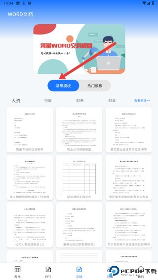 3、文档界面海量WORD文档模板标题突出,有常用模板、热门模板选项,展示人资、行政等类别模板,便于用户快速找到合适文档模板进行编辑制作。