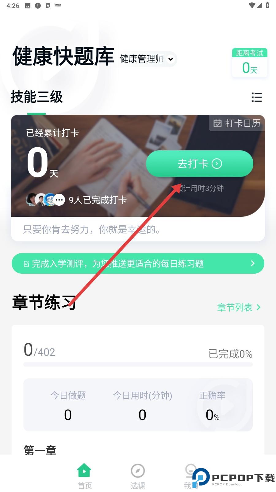 2、健康快题库页,显示技能三级打卡情况,可去打卡,有入学测评、章节练习板块,帮考生规划学习、刷题备考。