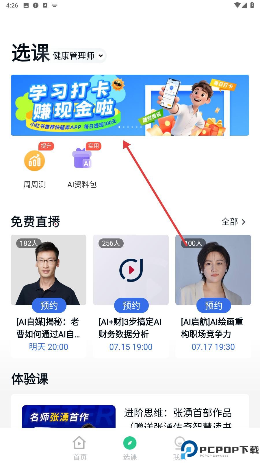 1、选课页,选健康管理师后,有学习打卡赚现金,及周周测、AI资料包等工具,还有免体验课,助力选课学习。