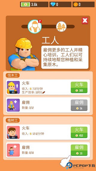2、雇佣更多的工人并精心培训,工人们以可持续地帮您种植和采集原木。在这里,玩家可以看到伐木工和植树工,并且雇佣的费用不同,接下来我们先雇佣一名伐木工吧!