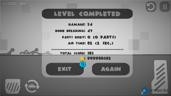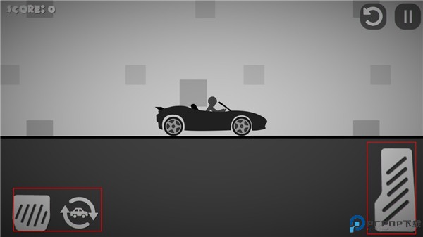 4、活用按钮,左边的按钮是让车减速或者后退的,右边长条的按钮是加速前进的,而有汽车标志的是让车重新从空中落下的,反复使用这三个按钮可以让火柴人受伤更多: