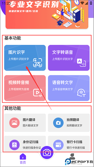 1、进入软件后,我们看到图片识字、文字转语音等基本功能和图片翻译、拍照翻译等其他功能,选择有需要的功能点击进入;
