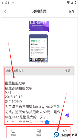 5、在识别结果页面您可以对比图片进行编辑文本,也可以一键复制、翻译、分享,又或者是将文本保存下来。