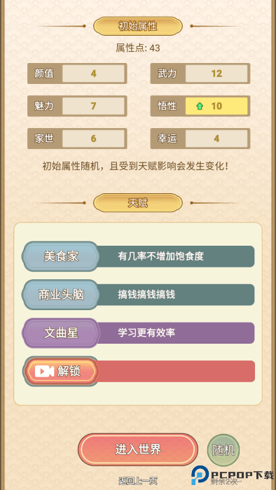 接下来就是初始属性与天赋技能选择了,现在可以免费刷新两次。